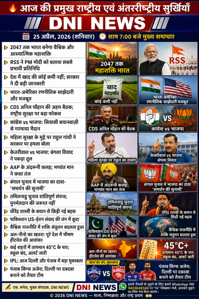 25 рдЕрдкреНрд░реИрд▓ 2026 рдХреА рдпреЗ рдЦрдмрд░реЗрдВ рд╕рд╛рдл рддреМрд░ рдкрд░ рджрд┐рдЦрд╛рддреА рд╣реИрдВ рдХрд┐ рднрд╛рд░рдд рдПрдХ рдРрд╕реЗ рджреМрд░ рд╕реЗ рдЧреБрдЬрд░ рд░рд╣рд╛ рд╣реИ рдЬрд╣рд╛рдВ рд╡рд┐рдХрд╛рд╕, рд░рд╛рдЬрдиреАрддрд┐, рдХреВрдЯрдиреАрддрд┐ рдФрд░ рд╕рд╛рдорд╛рдЬрд┐рдХ рдореБрджреНрджреЗ рд╕рднреА рдПрдХ рд╕рд╛рде рдЖрдЧреЗ рдмрдврд╝ рд░рд╣реЗ рд╣реИрдВред рдПрдХ рддрд░рдл рджреЗрд╢ 2047 рдХреЗ рд╡рд┐рдЬрд╝рди рдХреЗ рд╕рд╛рде рд╡реИрд╢реНрд╡рд┐рдХ рдиреЗрддреГрддреНрд╡ рдХреА рдУрд░ рдмрдврд╝ рд░рд╣рд╛ рд╣реИ, рд╡рд╣реАрдВ рджреВрд╕рд░реА рддрд░рдл рдЖрдВрддрд░рд┐рдХ рд░рд╛рдЬрдиреАрддрд┐ рдФрд░ рд╕рд╛рдорд╛рдЬрд┐рдХ рдЪреБрдиреМрддрд┐рдпрд╛рдВ рднреА рд╕рд╛рдордиреЗ рд╣реИрдВред