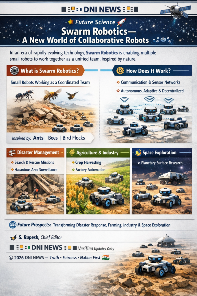 स्वार्म रोबोटिक्स भविष्य की एक उन्नत तकनीक है जो टीमवर्क के जरिए बड़े कामों को आसान बना सकती है। यह तकनीक आपदा प्रबंधन, कृषि, उद्योग और अंतरिक्ष जैसे क्षेत्रों में क्रांतिकारी बदलाव ला सकती है। आने वाले समय में यह तकनीक मानव जीवन को और अधिक सुरक्षित और प्रभावी बना सकती है।