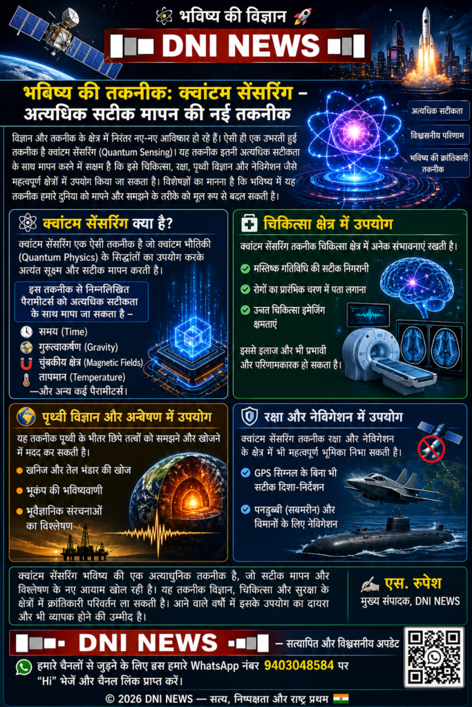 क्वांटम सेंसिंग भविष्य की एक अत्याधुनिक तकनीक है जो सटीक माप और विश्लेषण में नई संभावनाएं खोल रही है। यह तकनीक विज्ञान, चिकित्सा और सुरक्षा के क्षेत्र में बड़ा बदलाव ला सकती है। आने वाले समय में इसका उपयोग और अधिक बढ़ने की संभावना है।