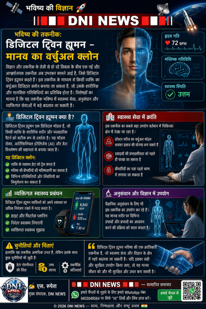 विज्ञान और तकनीक के क्षेत्र में तेजी से हो रही प्रगति के बीच अब एक नई और चौंकाने वाली तकनीक सामने आ रही है, जिसे डिजिटल ट्विन ह्यूमन (Digital Twin Human) कहा जाता है। इस तकनीक के माध्यम से किसी व्यक्ति का एक वर्चुअल डिजिटल क्लोन बनाया जा सकता है, जो उसकी शारीरिक और मानसिक गतिविधियों को मॉडल के रूप में दिखाता है। विशेषज्ञों का मानना है कि यह तकनीक भविष्य में स्वास्थ्य, रिसर्च और पर्सनल सेवाओं में बड़ा बदलाव ला सकती है।