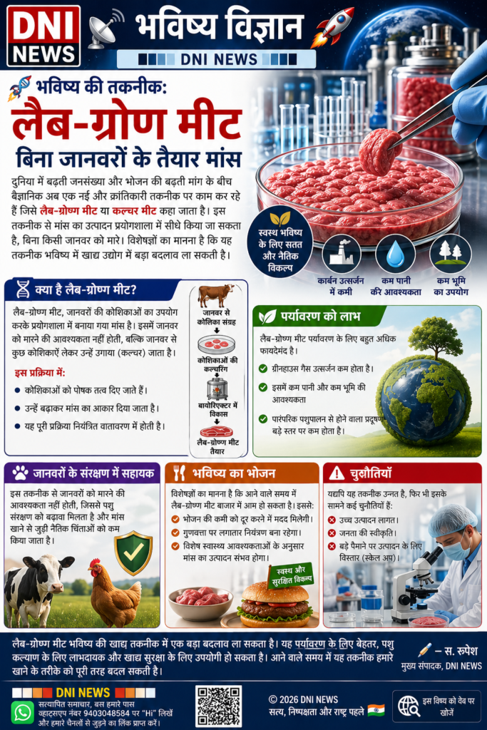 दुनिया में बढ़ती जनसंख्या और खाद्य जरूरतों के बीच वैज्ञानिक अब एक नई और क्रांतिकारी तकनीक पर काम कर रहे हैं, जिसे लैब-ग्रो मीट (Lab-Grown Meat) या कल्चर्ड मीट कहा जाता है। इस तकनीक के माध्यम से बिना जानवरों को मारे प्रयोगशाला (Lab) में ही मांस तैयार किया जा सकता है। विशेषज्ञों का मानना है कि यह तकनीक भविष्य में खाद्य उद्योग में बड़ा बदलाव ला सकती है।