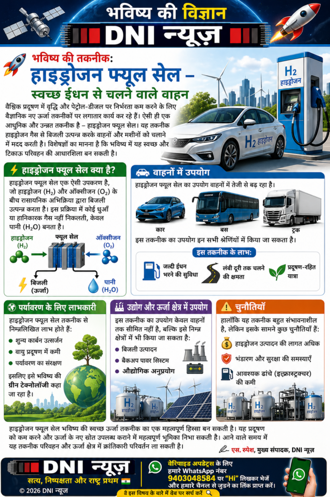 दुनिया में बढ़ते प्रदूषण और पेट्रोल-डीजल पर निर्भरता को कम करने के लिए वैज्ञानिक नई ऊर्जा तकनीकों पर काम कर रहे हैं। इसी दिशा में एक उन्नत तकनीक है हाइड्रोजन फ्यूल सेल (Hydrogen Fuel Cell)। यह तकनीक हाइड्रोजन गैस से बिजली बनाकर वाहनों और मशीनों को चलाने में मदद करती है। विशेषज्ञों का मानना है कि यह भविष्य में स्वच्छ और टिकाऊ परिवहन का मुख्य आधार बन सकती है।