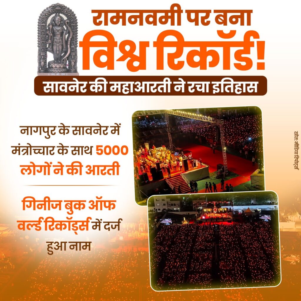 рд░рд╛рдордирд╡рдореА рдХреЗ рдкрд╛рд╡рди рдЕрд╡рд╕рд░ рдкрд░ рдорд╣рд╛рд░рд╛рд╖реНрдЯреНрд░ рдХреЗ рдирд╛рдЧрдкреБрд░ рдЬрд┐рд▓реЗ рдХреЗ рд╕рд╛рд╡рдиреЗрд░ рдореЗрдВ рднрдХреНрддрд┐, рдПрдХрддрд╛ рдФрд░ рд╕рд╛рдВрд╕реНрдХреГрддрд┐рдХ рдЧреМрд░рд╡ рдХрд╛ рдПрдХ рдРрддрд┐рд╣рд╛рд╕рд┐рдХ рджреГрд╢реНрдп рджреЗрдЦрдиреЗ рдХреЛ рдорд┐рд▓рд╛ред рдирдЧрд░ рдкрд░рд┐рд╖рдж рдореИрджрд╛рди рдореЗрдВ рдЖрдпреЛрдЬрд┐рдд рднрд╡реНрдп рдорд╣рд╛рдЖрд░рддреА рдиреЗ рди рдХреЗрд╡рд▓ рд╣рдЬрд╛рд░реЛрдВ рд╢реНрд░рджреНрдзрд╛рд▓реБрдУрдВ рдХреЛ рдПрдХ рдордВрдЪ рдкрд░ рдЬреЛрдбрд╝рд╛, рдмрд▓реНрдХрд┐ рдЧрд┐рдиреАрдЬ рдмреБрдХ рдСрдл рд╡рд░реНрд▓реНрдб рд░рд┐рдХреЙрд░реНрдбреНрд╕ рдореЗрдВ рдЕрдкрдирд╛ рдирд╛рдо рджрд░реНрдЬ рдХрд░ рдПрдХ рдирдпрд╛ рдЗрддрд┐рд╣рд╛рд╕ рд░рдЪ рджрд┐рдпрд╛ред