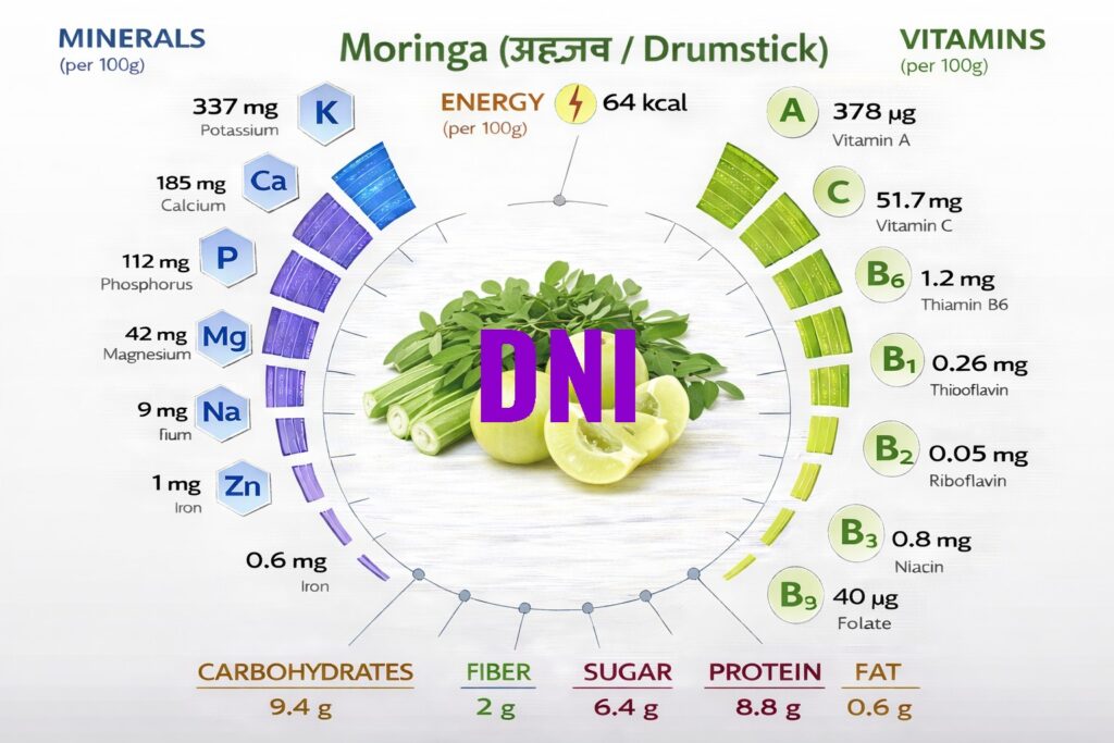 मोरिंगा के पत्ते, फल (ड्रमस्टिक), बीज और पाउडर – सभी बेहद पौष्टिक होते हैं। इसमें विटामिन A, C, कैल्शियम, आयरन, प्रोटीन और एंटीऑक्सीडेंट भरपूर मात्रा में पाए जाते हैं।